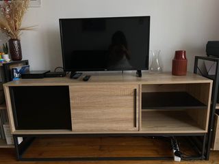 Je vends un meuble TV en bois, sobre et fonctionnel, en bon état général. Il offre une grande surface pour poser un écran large, ainsi que plusieurs espaces de rangement (étagèr