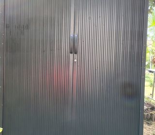 Vends armoire haute métallique noire portes à rideaux 5 étagères état satisfaisant l 120cm x p 45cm x h 198cm