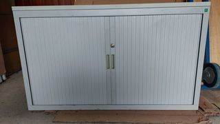 Vends meuble bas de rangement métallique dessus de finition en mélaminé blanc portes à rideaux 1 étagère bon état l 120cm x p 45cm x h 72cm