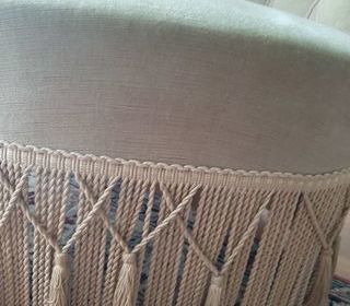 Très joli fauteuil crapaud de style Napoléon III en velours beige avec franges, glands et un dossier capitonné. Largeur 78cm profondeur 87cm hauteur 87cm Poids environ