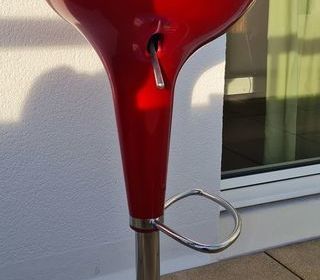 Vends 2 tabourets de bar réglables, acier chromé et résine de couleur rouge. Très bon état, les vérins hydrauliques fonctionnent. Réglage assise de 57cm à 78cm Remise en main p