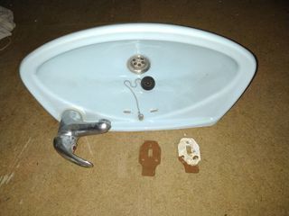 Description Vend lave mains bleu ciel en bon état Robinet et syphon à changer mais pas obligatoire car ils fonctionnent. Ce lave mains se fixe au mur , les supports sont four