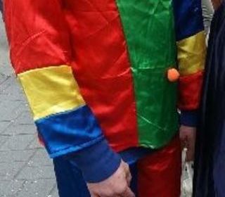 - COSTUME Clown ADULTE en 2 parties (haut chasuble + bas pantalon) + 5 ACCESSOIRES (Noeud papillon, Lunettes avec petites lampes, Perruque bouclée multicolore + 2 Nez rouge de clow