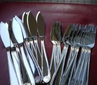 ENSEMBLE DE COUVERTS A POISSON se composant de : . 12 couteaux longueur 21 cm en inox . 12 fourchettes longueur 21 cm en inox Excellent état. Disponibles sur LILLE (secteur Cl