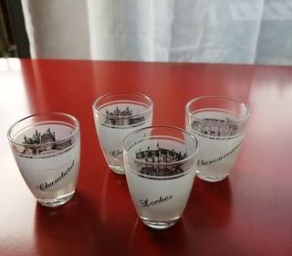 Lot de 4 verres à liqueur motif " Châteaux de la Loire " se composant de : . 2 verres motif " Château de Chambord " . 1 verre motif " Château de Loches " . 1 verre motif " Chât