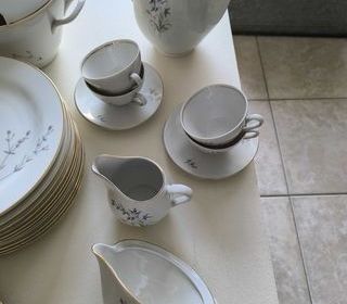 1 soupière avec couvercle, 1 saucière, 2 saladiers, 1 plat ovale, 11 assiettes creuses, 11 assiettes plates, 6 assiettes à dessert, 1 cafetière avec couvercle, 1 laitier,4 tasses