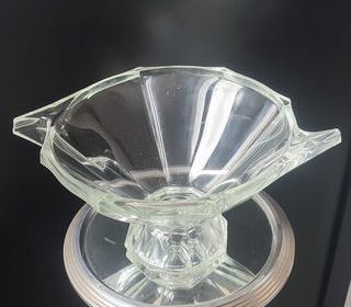 Grande coupe en verre lourd et épais, gravée Slovakia sous la base. Esthétique géométrique et architecturée, avec ses pans coupés, ses lignes et anses tendues et son pied facetté,