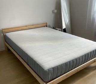 Vends lit (sommier + matelas) Taille : 140x190 Etat : Très bon (quelques petites tà¢ches sur le matelas mais rien de très voyant : voir les 2 derniers photos). Acheté il y a 2