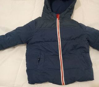 Doudoune pour garçon de 4 ans : 104cm. Extérieur bleu, doublure bleu bordé de gris au col ,et dans le bas , doublure manche rouge , tirette longue rouge et blanc. Déperlant , lavab