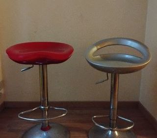 2 tabourets de bar, assise ajustable. Un rouge, un gris. A chercher sur place Possibilité de vendre un des deux. Les deux 30€, un 15€