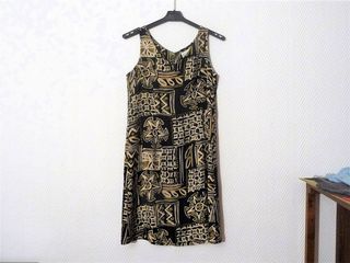 Robe Cintrée Mi Longue en 100% Viscose Bleu Marine Beige Vert- Canda * Robe mi longue bleu marine beige et vert clair, cintrée devant et derrière et se fermant par un bouton dan