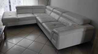 Canapé cuir blanc, long 2,70x2,20, démontable en deux parties Reposes tête relevables, bon état légère usure sur la couture d'une assise photo a l'appui, venir chercher sur place