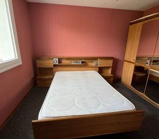 Je vends cet ensemble chambre composé d'un lit double en bois avec tête de lit intégrée et rangements, accompagné d'une armoire assortie. - Lit 140 x 190 cms - Tête de lit avec r