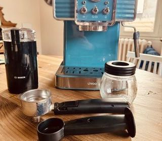 Je vends une machine à espresso LIVOO (coloris bleu vintage), en bon état de fonctionnement. Vendue avec : ? Moulin à café électrique Bosch ? Tamper ? Cuillère doseuse ? Pot
