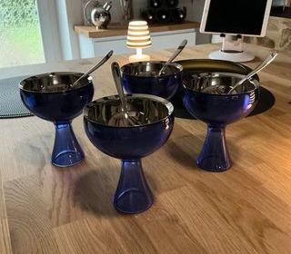 Lot de 4 Coupes à glaces Vintage Alessi avec 4 Cuillères Big love. En collaboration avec Haagen Dazs. Cuillères initialement conçues pour être utilisées par les amoureux partagean