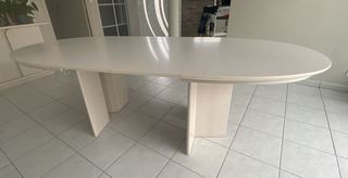 Vends ensemble table ovale avec 2 allonges marque Montana frêne blanchi + 4 chaises tissu décor automne. Dimension 160 x 100 + 2 allonges de 39 Abimée sur le dessus A venir ch