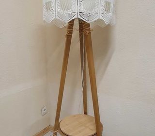 Lampadaire de salon stylé pas commun en chêne sauf le plateau qui est tournant pratique , l'ensemble décoré de dentelles et raphia du plu s bel effet . H = 1,70 m larg = 0,50m
