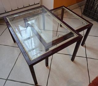2 tables basses en métal & verre Couleurs : bordeau & liseret couleur or Dimensions : - 55x41x32 cm pour la grande - 48x41x28 cm pour la petite