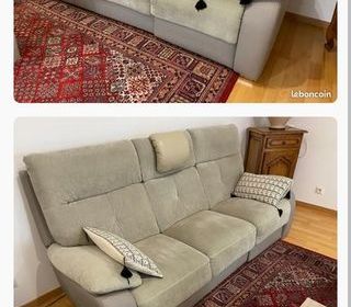 Canapé tissu beige de qualité en excellent état car peu servi avec 1 place relax électrique et 1 fauteuil assorti.