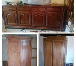 Vend 2 armoires anciennes dont 1 en penderie totale + étagère au-dessus. Prix 30€ 1 en demi penderie et 3 étagères sur la droite et une grande en haut. Prix 30€ 1 enfilade de 2m6