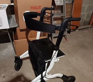 Très bon état. Très peu servi Déambulateur avec siège confortable..panier ..freins de marche et stationnement. 4 roues