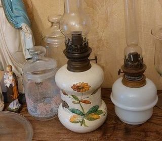 Lampes à pétrole avec verre. Une lampe en céramique ( années 70) une autre style Napoléon plus ancienne. En bon état.