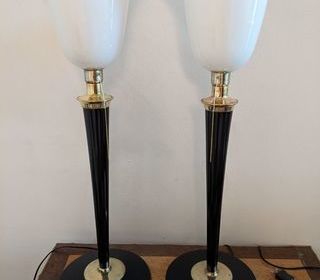 Paire de 2 lampes art déco MAZDA laquées noire avec tulipe en opaline et en bon état. D'époque art nouveau art déco vers 1930. Hauteur 78 cm diam 25 cm. Avec la douille E27 a tire