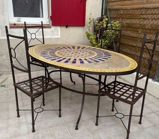 Table haute effet travertin. Hauteur 102cm, largeur60cm,longueur 120cm
