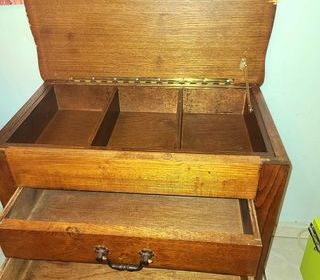 Bonjour, Je vends un meuble d'appoint en bois marron. Il peut servir de table d'appoint, comme de table basse ou de table de couture. Il est composé d'un plateau amovible