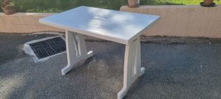 Particulier vends table de terrasse pliante en PVC Blanc en très bon état aspect et fonctionnel. Cette table est équipée de deux rallonges de 25 cm, stockées sous la table. Dime