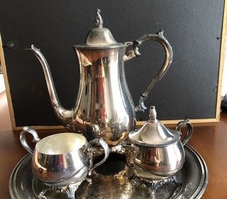Un plateau de 31,5 cm de diamètre, une théière de 27 cm de hauteur un sucrier et un pot à lait. USA ONEIDA Métal argenté