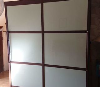 Armoire en bois massif finition mélaminé noyer Double portes coulissantes recouvertes de vitres opaques Côtés penderie et rayonnages l : 200 cm h : 230 cm p : 60 cm Très bon