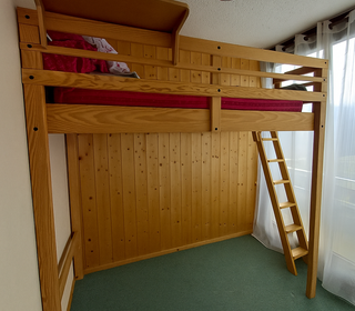 mezzanine en pin état neuf ouverture en bout avec échelle de 30 cm de largeur repliable contre le mur hauteur totale de la mezzanine 200cm longueur 202cm largeur 110cm marque