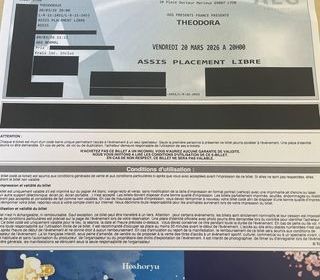 Je vend 3 billets pour le concert de Theodora de ce vendredi 20 Mars à Lyon Halle Tony Garnier. Places assises vendu cause imprévu familial? remise en main propre