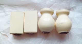 4 pieds d'occasion pour petit meuble, coffre, ... en bois massif 2 sont en bois tournés (avant du meuble) 2 sont de base carrée (à l'arrière du meuble) Peints blanc. Hauteur :