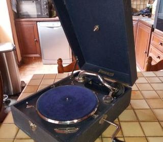 PHONOGRAPHE PORTABLE THORENS ( 78 tours) DES ANNEES 40 - 50 BON ETAT PORTABLE AVEC SA POIGNEE AVEC 22 DISQUES ANCIENS 78 TOURS ( PATHE , COLOMBIA, POLYDOR , PARNASSE,
