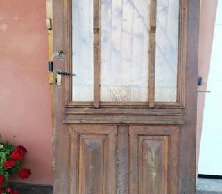 Vends porte d'entrée antique en bois massif avec moulures et vitrage ( à l'Aveyron 12400 saint Affrique) Cette porte comprend : - une serrure avec 3 clés - une poignée - 3 go