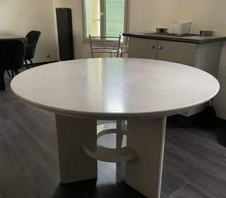 Vends cette table de cuisine ronde en bois blanc. - Type de produit : table de salle à manger/cuisine - Matériau : bois - Couleur : blanc - Forme : ronde - État : état sat