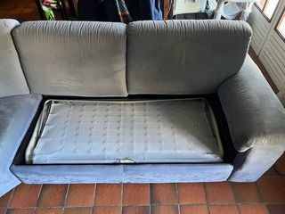 Vends canapé d'angle gauche 5 places en microfibre bleu, convertible. Largeur de lit 1,40m sur ressorts. Dimension 2,70m x 1,80m. Se démonte en 3 parties. Bon état général mais pré