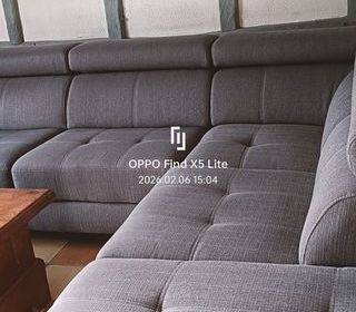 Canapé d'angle en tissu gris, doté de coussins capitonnés et d'accoudoirs rembourrés. Le canapé est composé de plusieurs sections formant un angle, visible sur la photo.