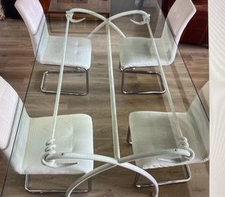 Table en verre épais et pieds en fer. Idéal 8 personnes Aucune rayure car elle était protégée.