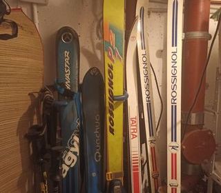 dans l'ordre des clichés = 3*descente puis 2*fond DYNASTAR AGL 6X / 150 CM QUESCHUA MRZ 100 / 165 CM ROSSIGNOL P27 SPORT / 185 CM TATRA SPORT GTI FIBERGLAS /167CM ROSSIGNOL