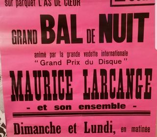 SUR PARQUET L'AS COEUR GRAND BAL DE NUIT ANIME PAR LA GRANDE VEDETTE INTERNATIONAL " GRAND PRIX DU DISQUES " MAURICE LARCANGE ET SON ENSEMBLE DIMANCHE ET LUNDI EN MATINÉ GRAND