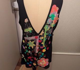 Haut sans manches noir CHRISTIAN LACROIX avec différentes sortes de pièces cousues sur l'avant. Taille 36 Très bon état quasi neuf car trop petit A récupérer sur place à Strasbo