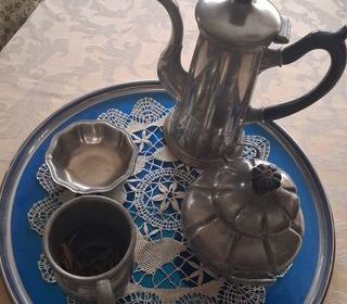 4 pièces en étain comprenant une cafetière, 2 sucriers, 1 pichet,