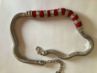 Joli collier fantaisie, moderne et original, argenté et rouge.
