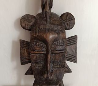 Vends masque traditionnel africain ancien, origine Côte d'Ivoire, ethnie Senufo, daté de 1969. Masque en bois sculpté, surmonté d'un oiseau stylisé, symbole de sagesse dans les cu