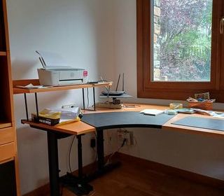 Grand bureau et accessoires : supports pour unité centrale, écran et imprimante, plus sous-main. La partie arrondie peut se fixer à droite ou à gauche. Le petit meuble à tiroir