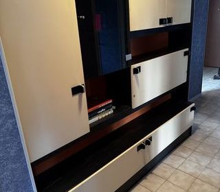 Je vends ce meuble de rangement style rétro en formica blanc et noir. - Type de produit : Bibliothèque & étagère - Matériau : Formica - Couleur : Blanc et noir - Pièce : Bureau
