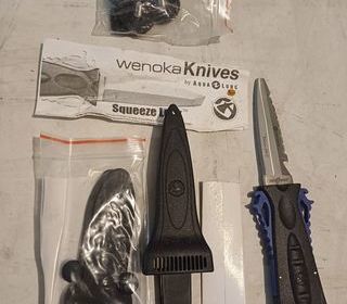 Article de sécurité VENOKA KNIVES AQUALUNG pour plongeur sous-marin qui se fixe sur le tuyau annelé du gilet de stabilisation avec 2 serflex, matériel neuf, jamais servi. Pas de p